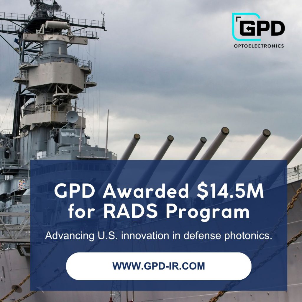 SALEM, N.H.–(BUSINESS WIRE)–GPD Optoelectronics Corp. (GPD), a U.S. manufacturer specializing in high-performance InGaAs and Germanium photodiodes, today announced it has been awarded a $14,455,986 contract to develop next-generation Software-defined Tactical Optical Modem for Performance and Ruggedization STOMPeR formerly known as Rugged Adaptive Detection and Signaling (RADS) technology.